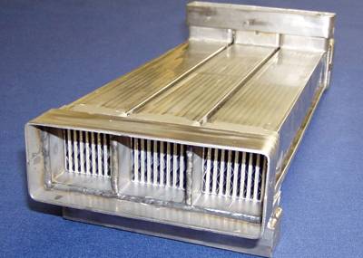 High-temperature foil-based heat exchanger Two grant programs (NSF & State of Ohio) were awarded to Catacel to develop a high-temperature, inexpensive heat exchanger "platform" (HEP). The device was small enough to be arranged in modules to form larger heat exchangers without the need for a lot of custom design & construction. Because it had to withstand temperatures up to 900°C, the HEP was made from oxidation-resistant stainless & nickel alloys. To keep costs down, most of the heat exchanger structure was made from thin foil; the foil was formed into an accordion shape and then furnace-brazed with cover sheets and thicker sheet metal ducts. |
