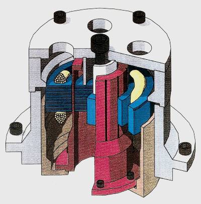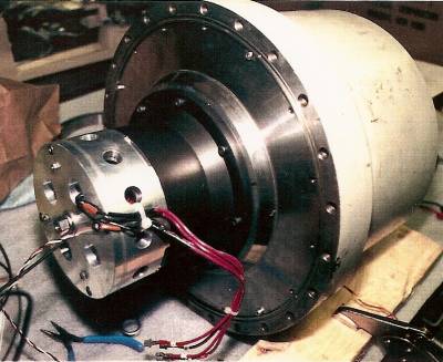 One of the mechanical challenges with this project was to make it assemble-able & serviceable. The rotor was a single piece of machined aluminum, to make it a simple robust component. The squirrel-cage itself was a radially thin section of the rotor, while the "endrings" of the rotor were thick sections just beyond the squirrel-cage. The cage had to spin within the narrow airgap, without the thick endrings striking any stationary parts during oscillation. The design required several concentrically fitting parts to be assembled in sequence. The motor was successful; it spun the main piston and created a non-contacting gas bearing. The design and its test results were published in a paper at the IECEC in 1989. The electromagnetics design was by Dr. Robert Redlich, the windings & inverter were by Scott McDonald, and the project was managed by Barry Penswick- it was a great team with everybody contributing something significant. |