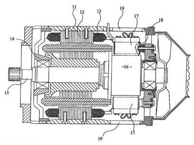 Aerospace Starter-Generator with extended overhaul period The starter-generator (S-G) in this case was for the APU of a commuter jet. The S-G was an air-cooled high-speed DC machine with four sets of brushes (No. 17 in the patent illustration at right). The time-between-overhauls (TBO) was limited by the life of the brushes. The customer wanted to increase the TBO by about 50%, so we explored several potential upgrades. Any upgrade, to be commercially viable, had to be implemented with minimal cost, since there were already thousands of these machines in the field. Then one day an associate brought up the idea of lengthening the brushes while keeping them in the same basic machine. |